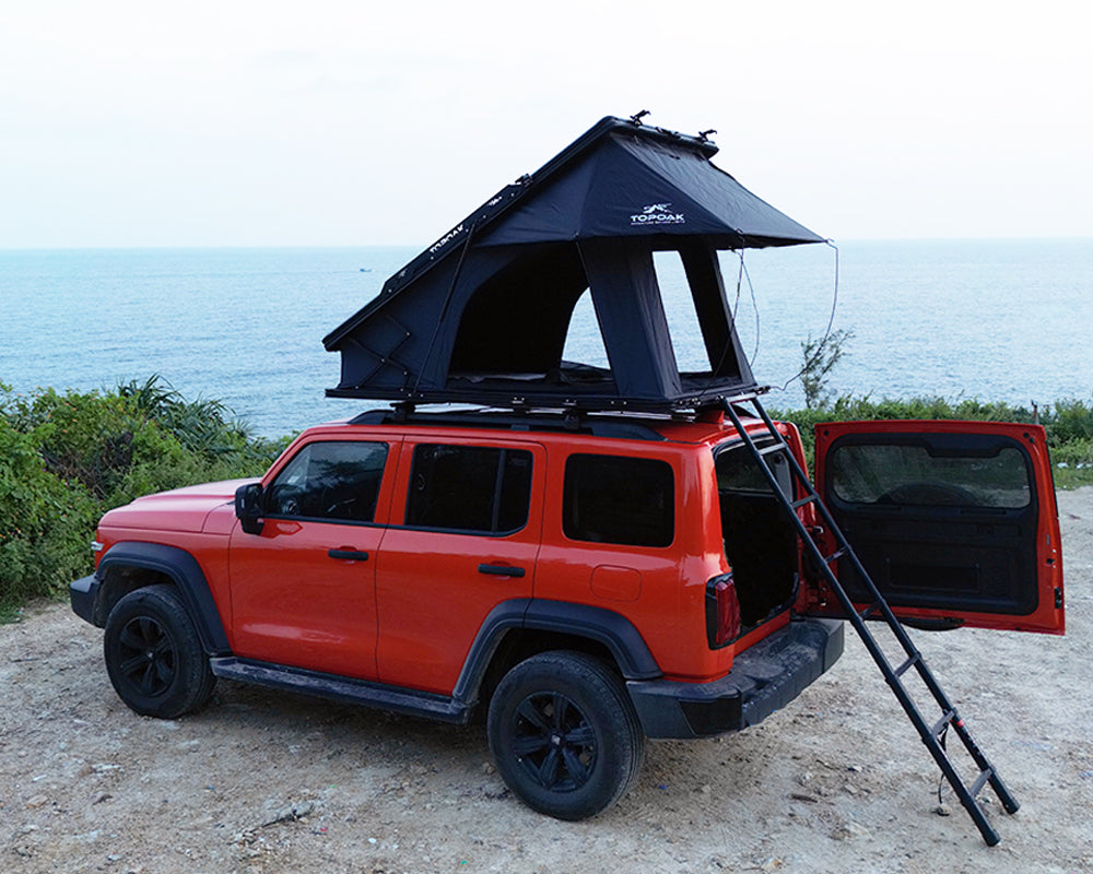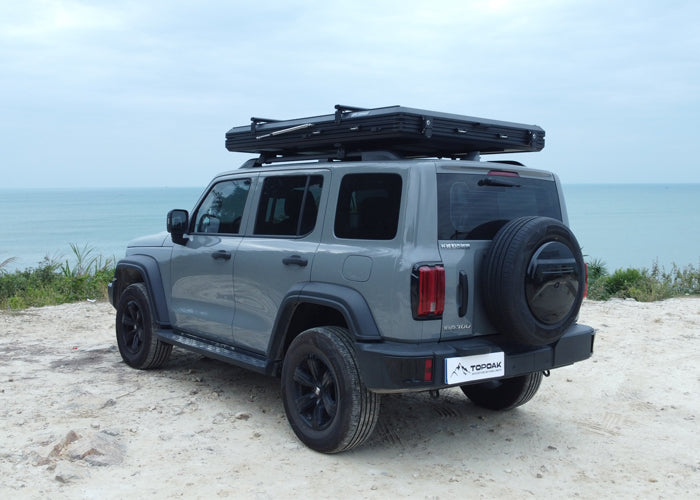 • Lift the tent onto your crossbars (you will need a friend or two) with the tent handle facing towards the rear of your vehicle, and the hinges at the front of your vehicle.